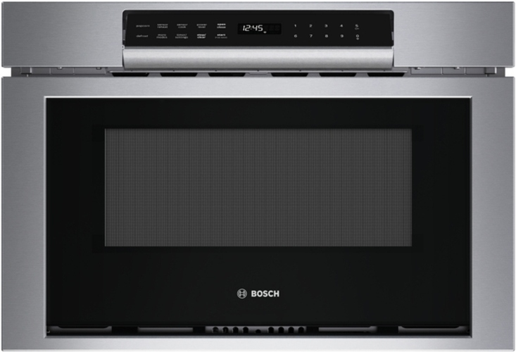 The 24" drawer microwave opens and closes automatically with the push of a button, and can be installed flush to cabinet. White touch control LCD matches Bosch wall ovens. Able to fit a 20 oz. cup or a 13" x 9" baking oven pan. Easy-to-read tilt out display disappears until you need it.Read More
