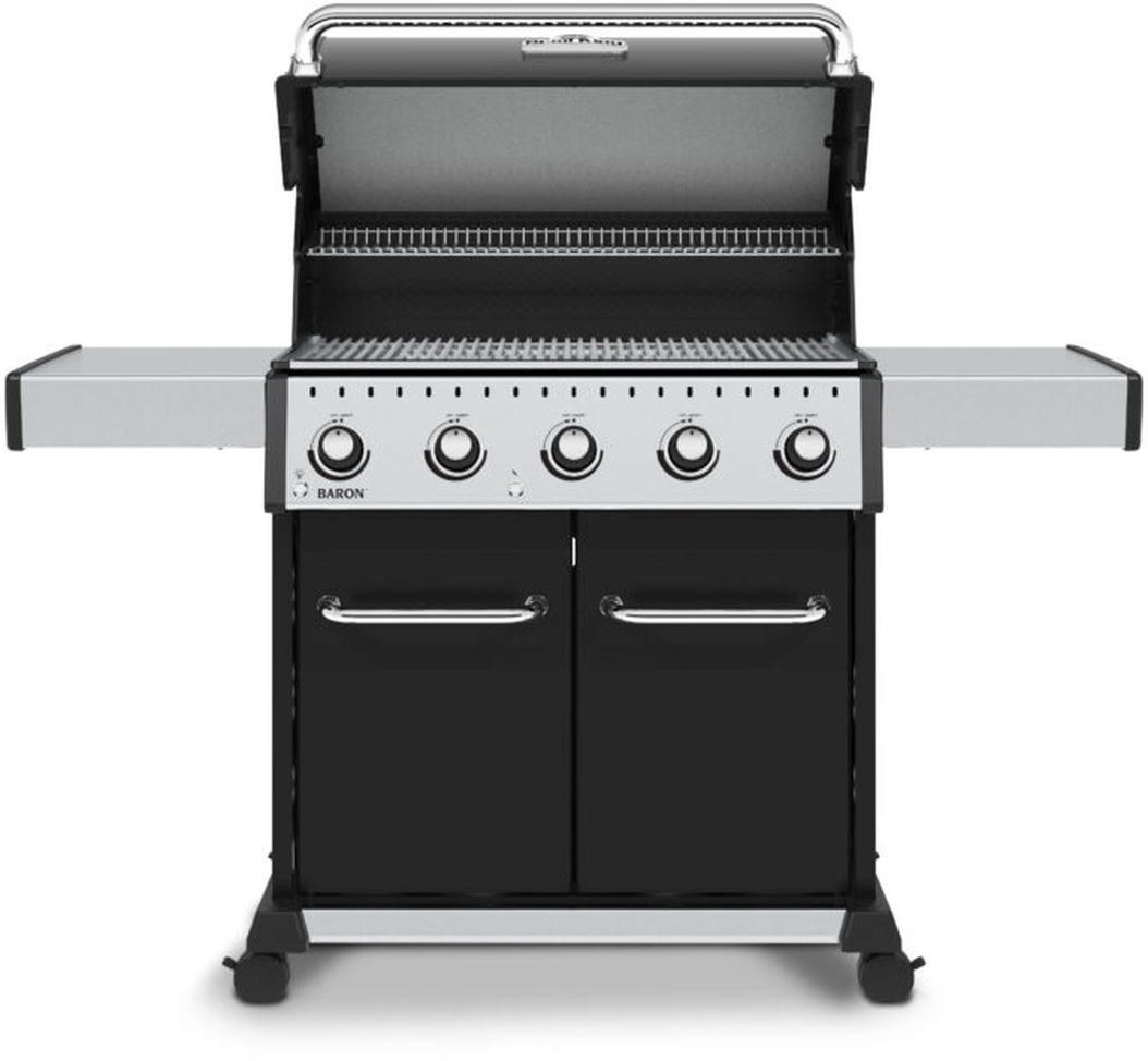 The Baron™ 520 Pro features a 570 sq. in. primary cooking surface and includes a durable cast aluminum oven, 5 stainless steel Dual-Tube™ burners, illuminated control panel lights, stainless steel 8mm rod cooking grids, stainless steel warming rack, stainless steel Flav-R-Wave™ cooking system, electronic ignition, stainless steel drop-down side shelves, and an enclosed black cabinet base.Read More
