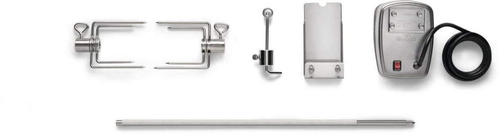 Kit contains: 1 heavy duty rotisserie motor, 1 food grade, stainless steel rotisserie spit rod, 2 large, stainless steel rotisserie forks, 1 stainless steel counter balance assembly, 1 stainless steel stop bushing, 1 T-handle